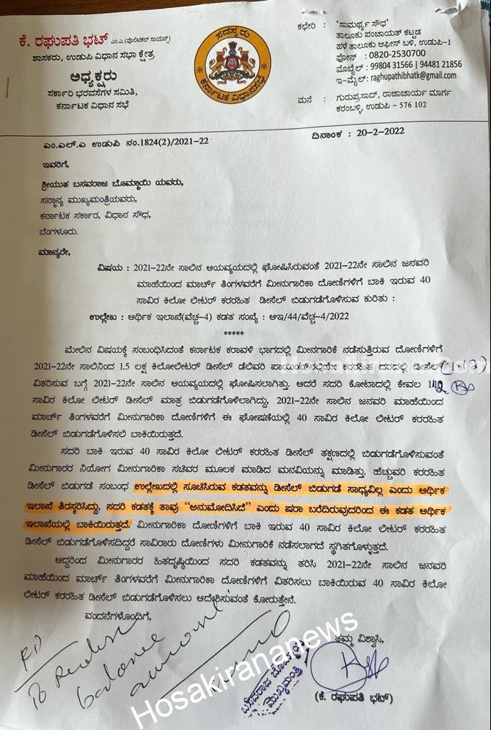 ಮೀನುಗಾರಿಕಾ ದೋಣಿಗಳಿಗೆ ಬಾಕಿ ಇದ್ದ 37,500 ಕಿಲೋ ಲೀಟರ್ ಕರರಹಿತ ಡೀಸೆಲ್ ಬಿಡುಗಡೆಗೆ ಮುಖ್ಯಮಂತ್ರಿ ಆದೇಶ – ಶಾಸಕ ರಘುಪತಿ ಭಟ್ ಅಭಿನಂದನೆ