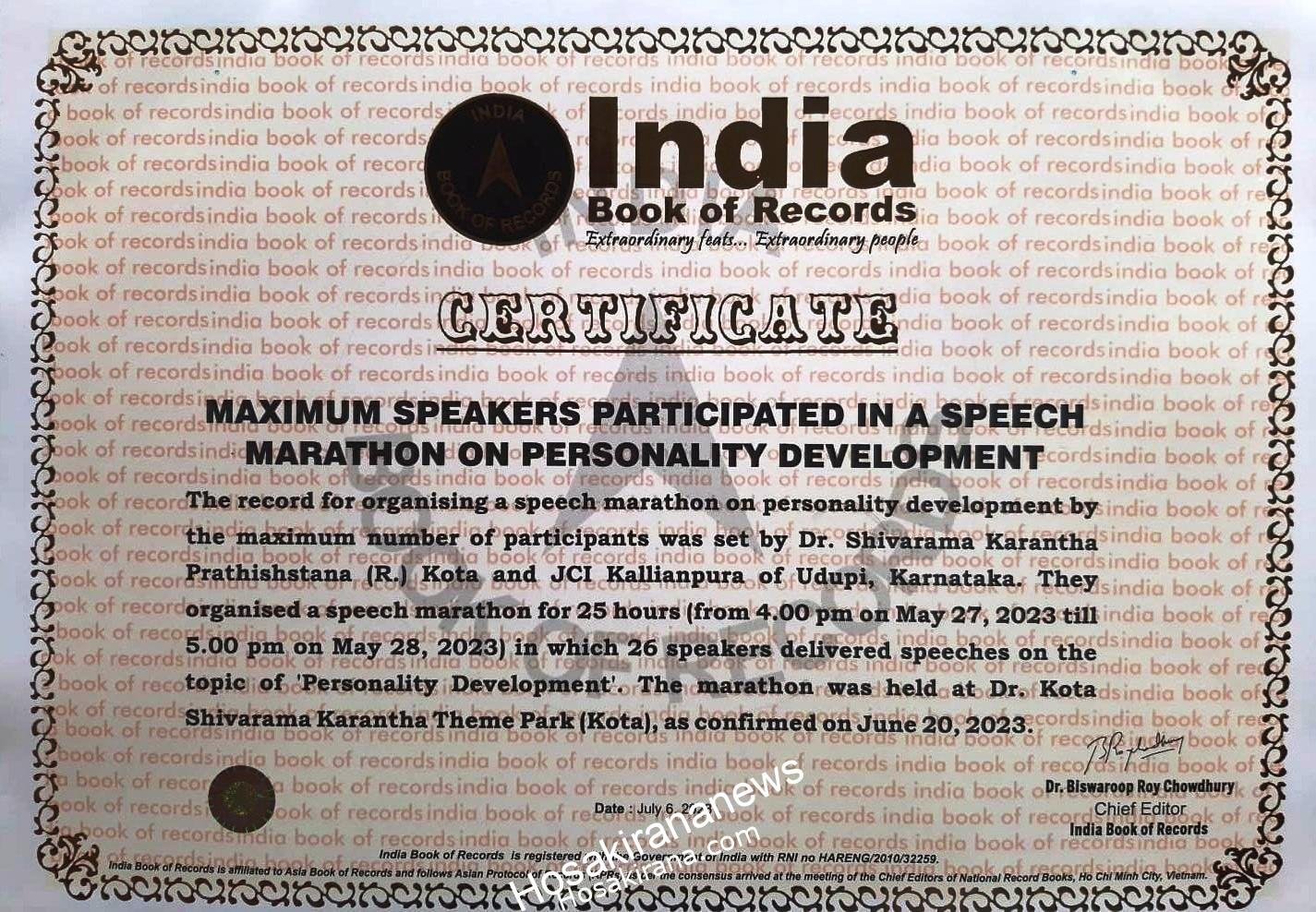 ಇಂಡಿಯಾ ಬುಕ್ ಆಫ್ ರೆಕಾರ್ಡ್ ದಾಖಲೆಗೆ ಡಾ. ಶಿವರಾಮ ಕಾರಂತ ಪ್ರತಿಷ್ಠಾನ ಮತ್ತು ಜೆಸಿಐ ಕಲ್ಯಾಣಪುರ