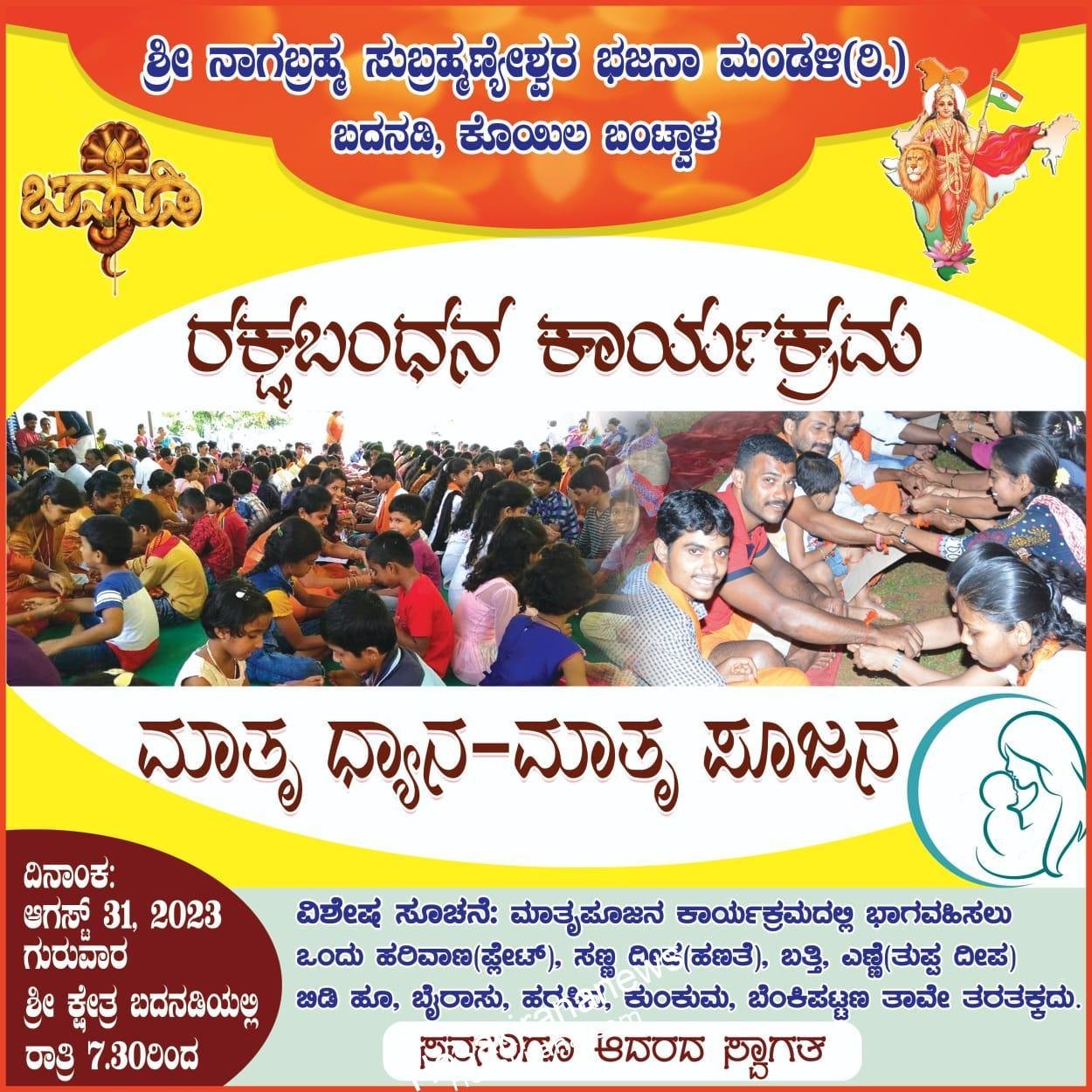 ಆ.31 ರಂದು ಶ್ರೀ ನಾಗಬ್ರಹ್ಮ ಸುಬ್ರಹ್ಮಣ್ಯೇಶ್ವರ ಭಜನಾ ಮಂಡಳಿ (ರಿ.) ಬದನಡಿ ವತಿಯಿಂದ ರಕ್ಷಾ ಬಂಧನ , ಮಾತೃ ಧ್ಯಾನ -ಮಾತೃ ಪೂಜನ ಕಾರ್ಯಕ್ರಮ