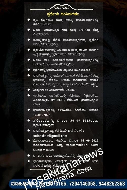 ಸ್ಪರ್ಧೆಗೆ ಬಂದ ಛಾಯಾಚಿತ್ರವನ್ನು ಯಾವುದೇ ಪೂರ್ವಾನುಮತಿ ಇಲ್ಲದೆ ಬಳಸುವ ಹಕ್ಕನ್ನು ಪಡೆದಿರುತ್ತದೆ. ಛಾಯಾಚಿತ್ರಗಳನ್ನು ಕಳಿಸ ಬೇಕಾದ ಇಮೈಲ್ : salonskpa@gmail.com. ಸಂಪರ್ಕ: 9019573166, 7204146368, 9448252363