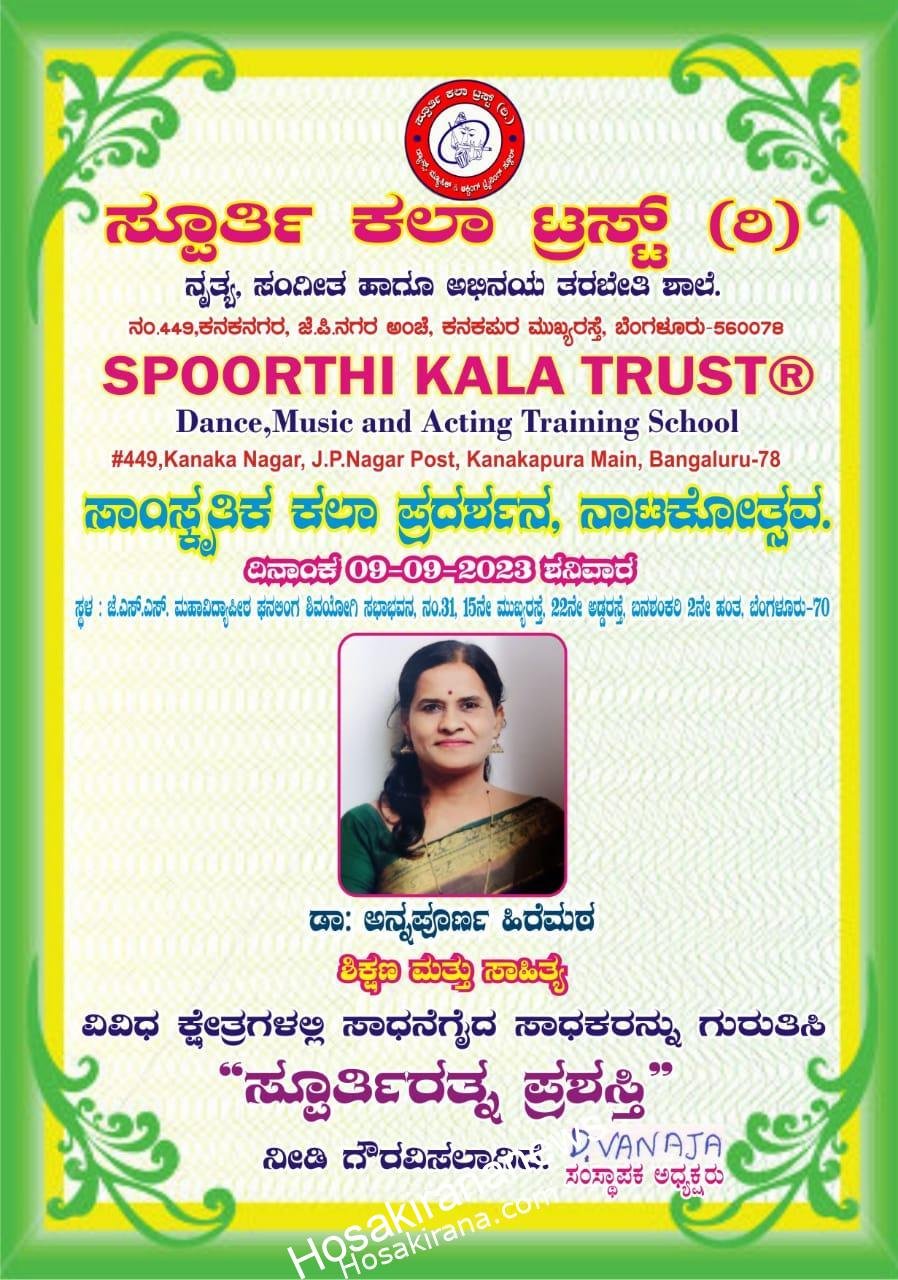 ಬೆಳಗಾವಿ-ಸ್ಪೂರ್ತಿ ಕಲಾ ಟ್ರಸ್ಟ್ ಬೆಂಗಳೂರು ಇವರು ತಮ್ಮ ಪ್ರಸಿದ್ಧ ಸಂಸ್ಥೆಯಿಂದ ಸಾಧಕರಿಗೆ ಕಲಾ ರತ್ನ ,ಶಿಕ್ಷಕರ ರತ್ನ ಸ್ಪೂರ್ತಿ ರತ್ನ ಹೀಗೆ ಹಲವಾರು ಕ್ಷೇತ್ರದಲ್ಲಿ ಸಾಧನೆಗೈದ ರ ಸಾಧಕರನ್ನು ರಾಜ್ಯದಾದ್ಯಂತ ಹುಡುಕಿ ಪ್ರೀತಿಯಿಂದ ಗೌರವ ನೀಡಿ ಸನ್ಮಾನಿಸಿದರು. ಅದರಲ್ಲಿ ಬೆಳಗಾವಿಯ ಸಾಹಿತಿ , ಶಿಕ್ಷಕಿ, ಸಾಮಾಜಿಕ ಲೇಖಕಿ, ಡಾ ಅನ್ನಪೂರ್ಣ ಹಿರೇಮಠ ಅವರಿಗೆ ಅವರ ಪ್ರತಿಭೆಯನ್ನು ಅವರೇ ಹುಡುಕಿ ಶಿಕ್ಷಣ ಮತ್ತು ಸಾಹಿತ್ಯ ಕ್ಷೇತ್ರದಲ್ಲಿ ಅವರು ಮಾಡಿದ ಸಾಧನೆ ಮತ್ತು ಕಾಯಕವನ್ನು ಗಣನೆಗೆ ತೆಗೆದುಕೊಂಡು ಸ್ಪೂರ್ತಿರತ್ನ ಪ್ರಶಸ್ತಿ ನೀಡಿ ಗೌರವಿಸಿಸಿದ್ದಾರೆ.