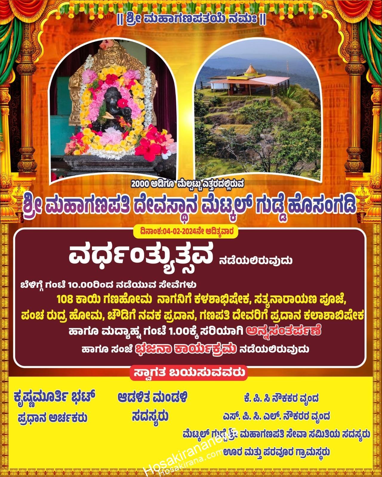 ಸಿದ್ದಾಪುರ*: ಉಡುಪಿ ಜಿಲ್ಲೆಯ ಹೊಸಂಗಡಿಯಿಂದ 6 ಕಿ.ಮೀ ದೂರದಲ್ಲಿರುವ , ಸಮುದ್ರ ಮಟ್ಟದಿಂದ 2000 ಅಡಿಗೂ ಮೆಲ್ಪಟ್ಟು ಎತ್ತರದಲ್ಲಿರುವ ಮೆಟ್ಕಲ್ ಗುಡ್ಡೆಯ ಶ್ರೀ ಮಹಾಗಣಪತಿ ದೇವಸ್ಥಾನದ ವರ್ಧಂತ್ಯುತ್ಸವವು…