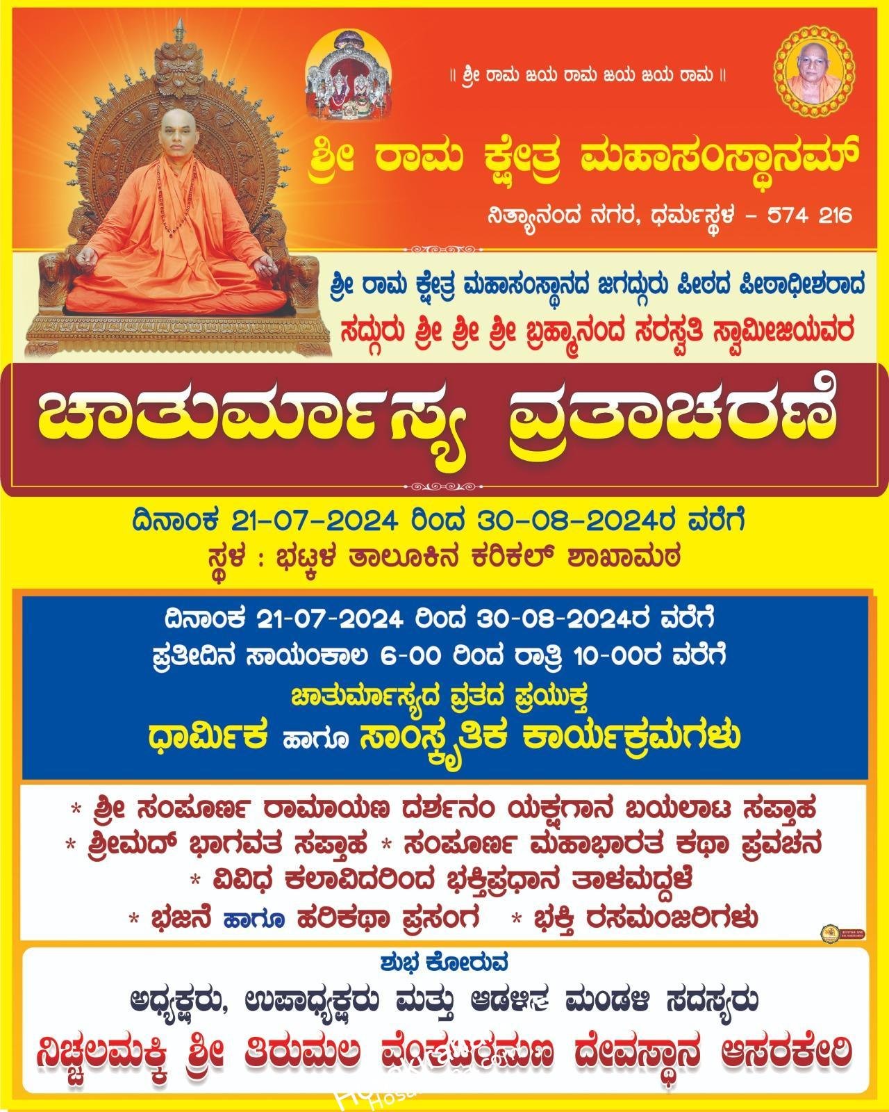 ಕನ್ಯಾಡಿ  ಶ್ರೀ ರಾಮಕ್ಷೇತ್ರ ಮಹಾಸಂಸ್ಥಾನದ ಜಗದ್ಗುರುಗಳಾದ ಶ್ರೀ ಶ್ರೀ ಶ್ರೀ ಬ್ರಹ್ಮಾನಂದ  ಸರಸ್ವತಿ ಸ್ವಾಮೀಜಿಯವರ ಚಾತುರ್ಮಾಸ ವೃತಾಚರಣೆ ಭಟ್ಕಳ ತಾಲೂಕಿನ  ಕರಿಕಲ್ ನಲ್ಲಿರುವ ಶಾಖಾಮಠದಲ್ಲಿ ಜುಲೈ 21 ರವಿವಾರದಿಂದ ಆರಂಭ