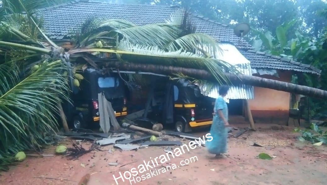ಕುಕ್ಕೆಹಳ್ಳಿ : ತೆಂಗಿನ ಮರ ಬಿದ್ದು ಮನೆ ಮತ್ತು ಎರಡು ರಿಕ್ಷಾಕ್ಕೆ ಹಾನಿ