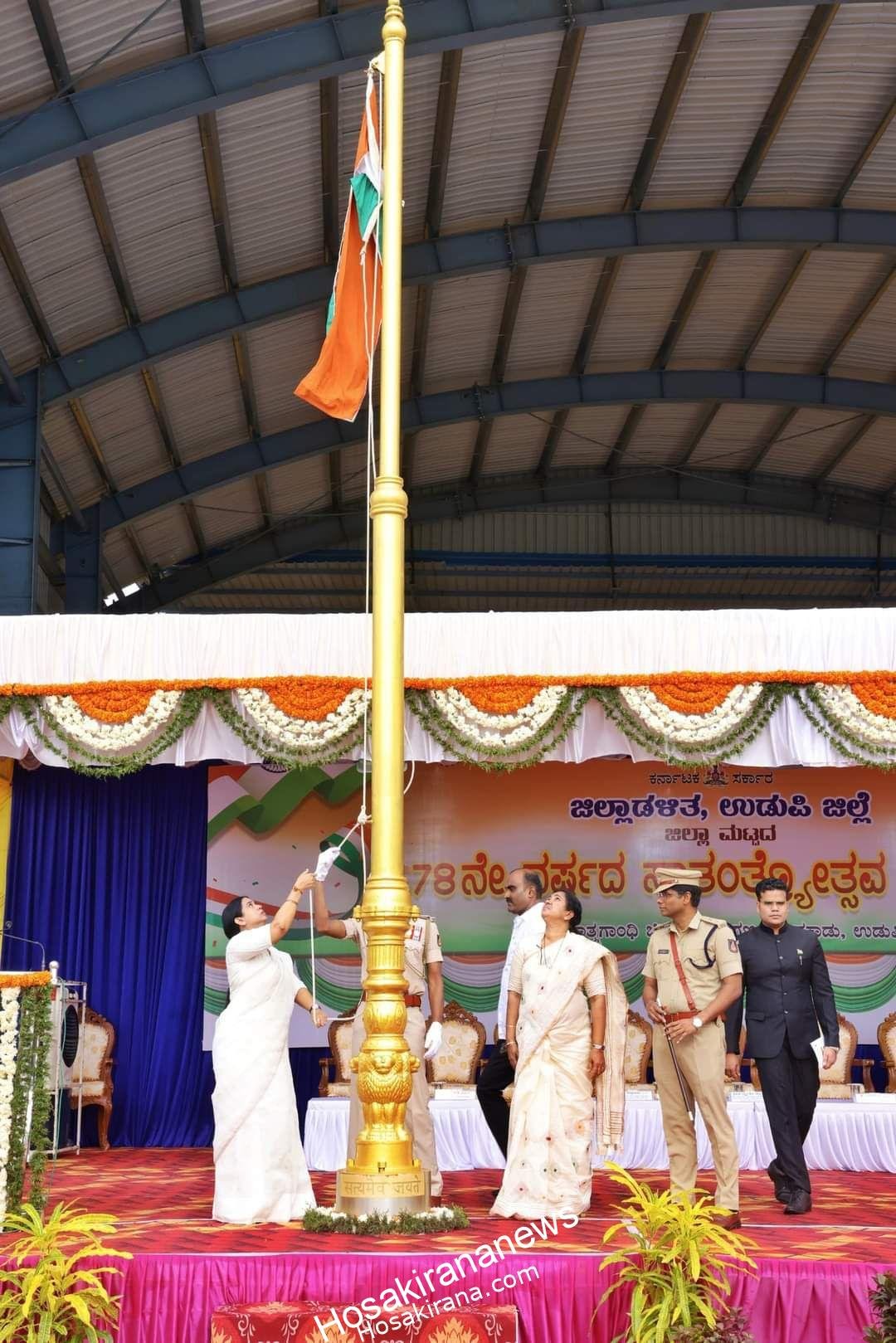 ಉಡುಪಿಯ ಅಜ್ಜರಕಾಡುವಿನಲ್ಲಿರುವ ಮಹಾತ್ಮ ಗಾಂಧಿ ಜಿಲ್ಲಾ ಕ್ರೀಡಾಂಗಣದಲ್ಲಿ ಗುರುವಾರ ನಡೆದ 78ನೇ ಸ್ವಾತಂತ್ರ್ಯ ದಿನಾಚರಣೆಯಲ್ಲಿ ಮಹಿಳಾ ಮತ್ತು ಮಕ್ಕಳ ಅಭಿವೃದ್ಧಿ ಇಲಾಖೆ ಸಚಿವರು ಹಾಗೂ ಉಡುಪಿ ಜಿಲ್ಲಾ ಉಸ್ತುವಾರಿ ಸಚಿವರಾದ ಲಕ್ಷ್ಮೀ ಹೆಬ್ಬಾಳಕರ್ ಧ್ವಜಾರೋಹಣ ನೆರವೇರಿಸಿದರು.