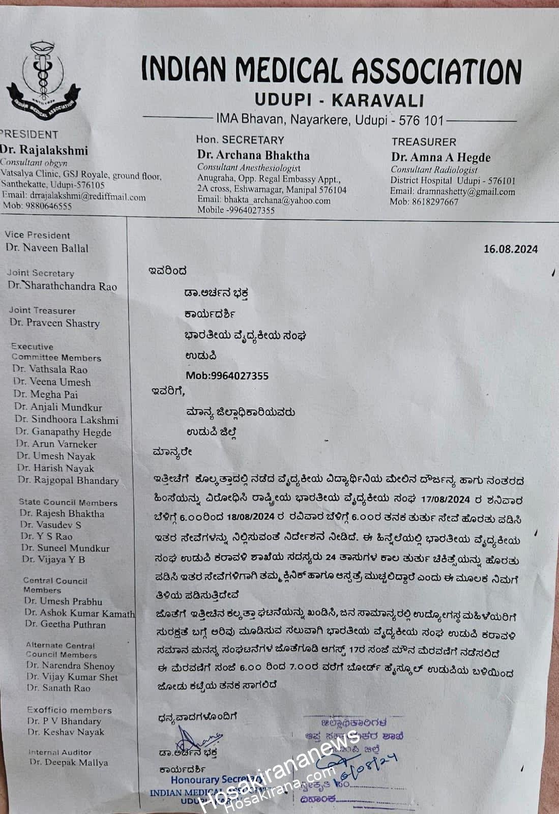 ಈ ಹಿನ್ನೆಲೆಯಲ್ಲಿ ಭಾರತೀಯ ವೈದ್ಯಕೀಯ ಸಂಘ ಉಡುಪಿ ಕರಾವಳಿ ಶಾಖೆಯ ಸದಸ್ಯರು 24 ತಾಸುಗಳ ಕಾಲ ತುರ್ತು ಚಿಕಿತ್ಸೆಯನ್ನು ಹೊರತು ಪಡಿಸಿ ಇತರ ಸೇವೆಗಳಿಗಾಗಿ ತಮ್ಮ ಕ್ಲಿನಿಕ್ ಹಾಗೂ ಆಸ್ಪತ್ರೆ ಮುಚ್ಚಲಿದ್ದಾರೆ ಎಂದು ಈ ಮೂಲಕ  ನಿಮಗೆ ತಿಳಿಯ ಪಡಿಸುತ್ತಿದೇವೆ.