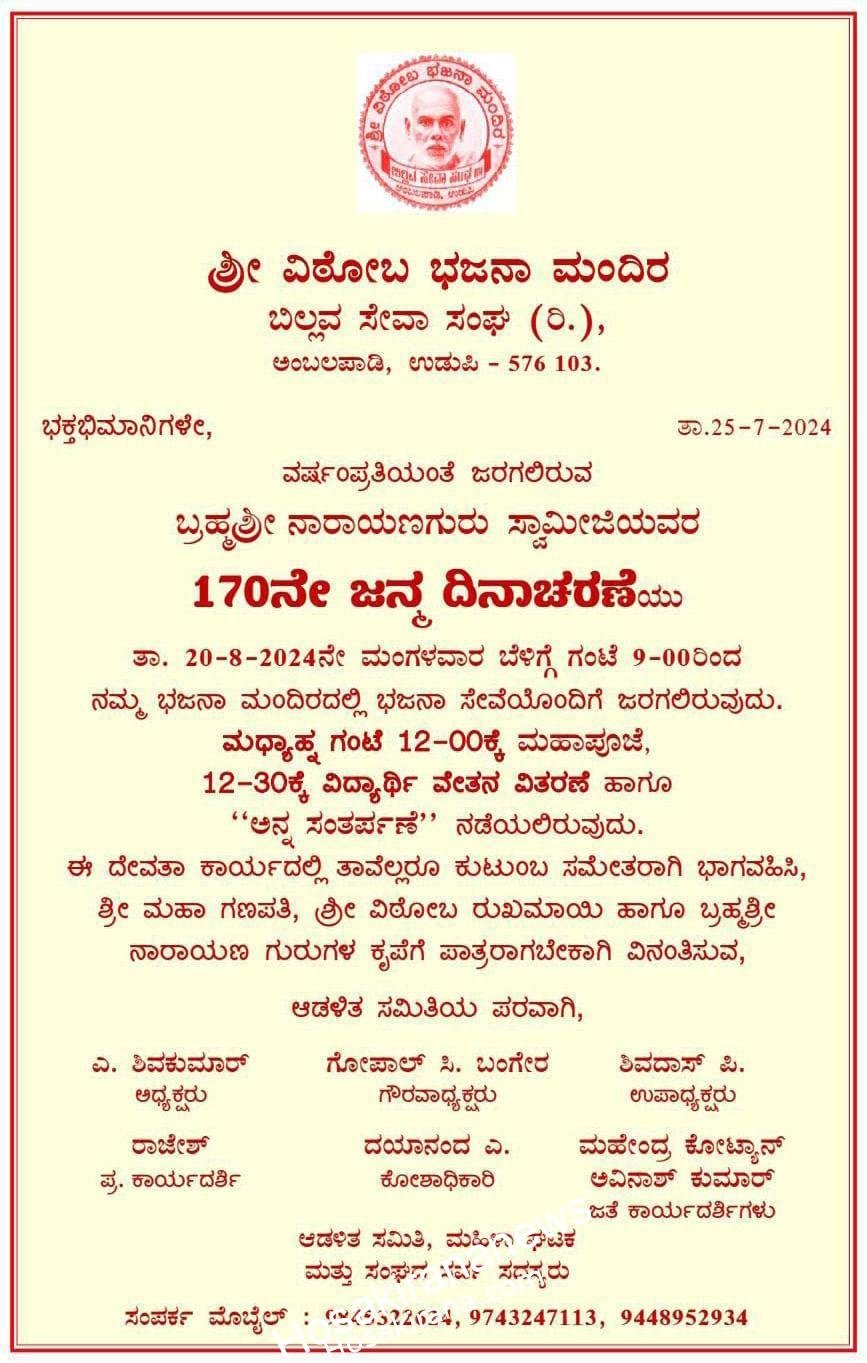ಬಿಲ್ಲವ ಸೇವಾ ಸಂಘ(ರಿ.), ಶ್ರೀ ವಿಠೋಬ ಭಜನಾ ಮಂದಿರ, ಅಂಬಲಪಾಡಿ ಇದರ ವತಿಯಿಂದ ಬ್ರಹ್ಮಶ್ರೀ ನಾರಾಯಣ ಗುರು ಸ್ವಾಮೀಜಿಯವರ 170ನೇ ಜನ್ಮ ದಿನಾಚರಣೆಯು ಆ.20 ಮಂಗಳವಾರ ಬೆಳಿಗ್ಗೆ ಗಂಟೆ 9.00ರಿಂದ ಭಜನಾ ಸೇವೆಯೊಂದಿಗೆ ಶ್ರೀ ವಿಠೋಬ ಭಜನಾ ಮಂದಿರದಲ್ಲಿ ಜರಗಲಿದೆ ಎಂದು ಸಂಘದ ಅಧ್ಯಕ್ಷ ಶಿವಕುಮಾರ್ ಅಂಬಲಪಾಡಿ ತಿಳಿಸಿದ್ದಾರೆ.