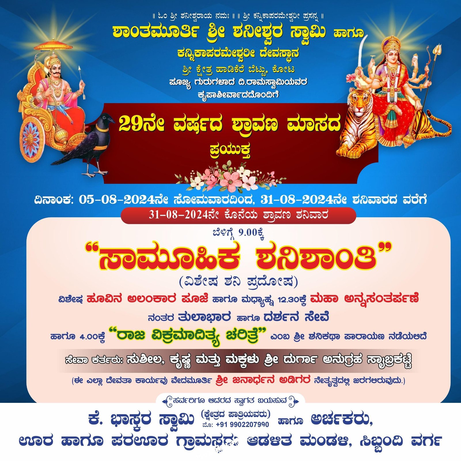 ಕೋಟ : 29ನೇ ವರ್ಷದ ಶ್ರಾವಣ ಮಾಸದ ಪ್ರಯುಕ್ತ ಉಡುಪಿ ಜಿಲ್ಲೆಯ ಕೋಟದ ಶಾಂತಮೂರ್ತಿ ಶ್ರೀ ಶನಿವಾರ ದೇವಸ್ಥಾನದಲ್ಲಿ ಆ.31 ರಂದು ಬೆಳಿಗ್ಗೆ 9ಕ್ಕೆ “ಸಾಮೂಹಿಕ ಶನಿಶಾಂತಿ”(ವಿಶೇಷ…