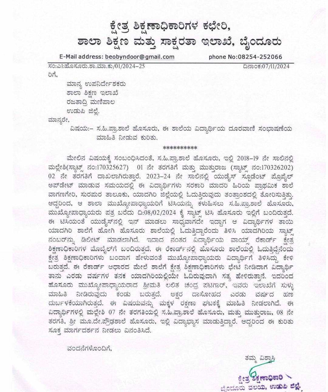 ಈಕೆಗೆ ಇಷ್ಟಾದರೂ ಬುದ್ಧಿ ಬಂದಿಲ್ಲ, ಇದಕ್ಕೆ ಪೂರಕವಾಗಿ ಕೊರೋನ ಕಾಲದಲ್ಲಿ ಈ ಎರಡು ಮಕ್ಕಳು ತಮ್ಮ ಊರಿಗೆ ತೆರಳಿ ಯಾದಗಿರಿ ಶಾಲೆಯಲ್ಲಿದಾಖಲಾಗಿದ್ದರು, ಮಕ್ಕಳ ಪರವಾಗಿ ಟೀಚರ್ ಗಣೇಶ್, ಸೌಮ್ಯ, ಸಂಗೀತರವರು ಮುತ್ತುರಾಜ್ ಮತ್ತು ಮಲ್ಲೇಶಿ ಹೊಸೂರು ಶಾಲೆಯಲ್ಲಿ ಕಲಿಯುತ್ತಿದ್ದಾರೆ ಎಂದು ಹಾಜರಾತಿ ಹಾಕಿ, ಮಕ್ಕಳ ಪರವಾಗಿ ತಾವೇ ಪರೀಕ್ಷೆಯಲ್ಲಿ ಪ್ರಶ್ನೆ ಪತ್ರಿಕೆಯನ್ನು ಬರೆದಿದ್ದಾರೆ ಎಂದು ಪ್ರಸುತ್ತ SDMC ಸದಸ್ಯ ರಾಘವೇಂದ್ರ ಪೂಜಾರಿ BEO ಮತ್ತು ಮಾಧ್ಯಮಗಳಿಗೆ ಅವರಿಗೆ ಮೌಖಿಕವಾಗಿ ಮತ್ತು ದೂರವಾಣಿ ಮೂಲಕ ದೂರು ನೀಡಿ ಕೆಲವು ದಾಖಲೆಯನ್ನು ನೀಡಿರುತ್ತಾರೆ.