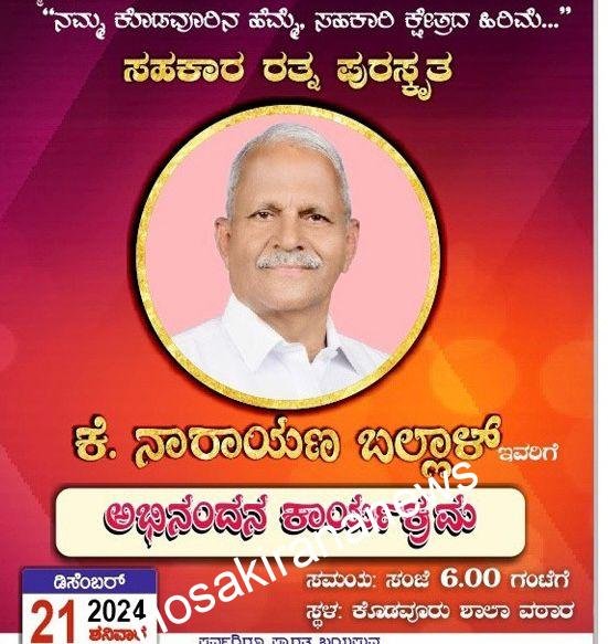 ಸಹಕಾರ ರತ್ನ ಕೆ. ನಾರಾಯಣ ಬಲ್ಲಾಳ್ ಅಭಿನಂದನ ಸಮಿತಿ ವತಿಯಿಂದ ಸಹಕಾರ ರತ್ನ ಪುರಸ್ಕ್ರತರಾದ ಕೆ. ನಾರಾಯಣ ಬಲ್ಲಾಳ್ ರವರಿಗೆ ಊರ ನಾಗರಿಕರ ಪರವಾಗಿ ಅಬಿನಂದನ ಸಮಾರಂಭವು…