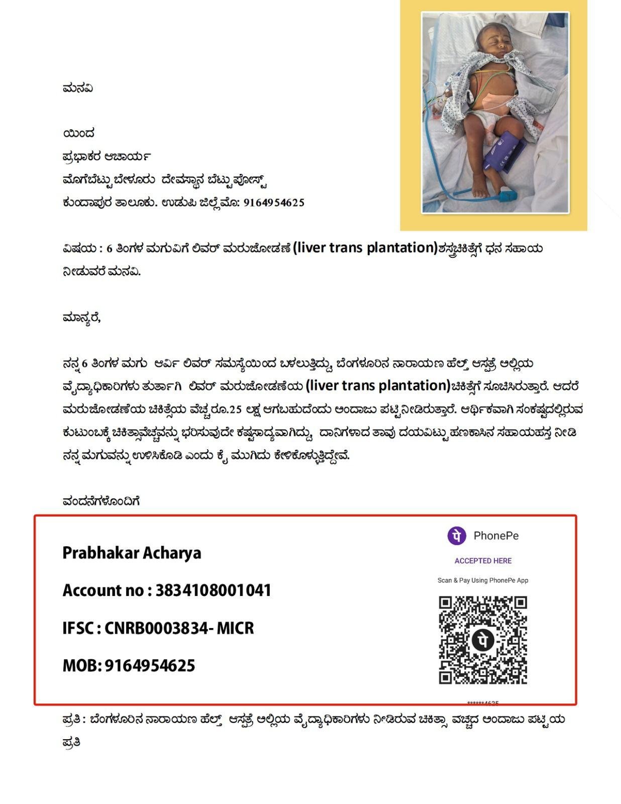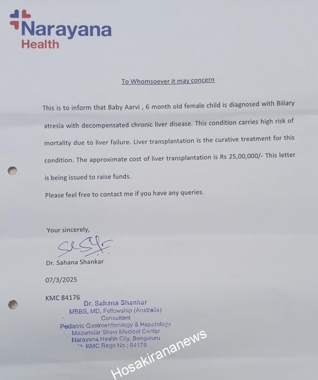 ಬೇಬಿ ಆರ್ವಿ, 6 ತಿಂಗಳ ಹೆಣ್ಣು ಮಗುವಿಗೆ ದೀರ್ಘಕಾಲದ ಯಕೃತ್ತಿನ ಕಾಯಿಲೆಯೊಂದಿಗೆ ಪಿತ್ತರಸ ಅಟ್ರೆಸಿಯಾ ರೋಗ ಪೀಡಿತರಾಗಿದ್ದು, ಯಕೃತ್ತಿನ ವೈಫಲ್ಯವಾಗಿದೆ ಎಂದು ವೈದ್ಯರು ತಿಳಿಸಿದ್ದಾರೆ. ಪಿತ್ತಜನಕಾಂಗದ ಕಸಿ ಈ ಸ್ಥಿತಿಗೆ ರೋಗನಿರೋಧಕ ಚಿಕಿತ್ಸೆಯಾಗಿದೆ ಎನ್ನಲಾಗಿದೆ. ಪಿತ್ತಜನಕಾಂಗದ ಕಸಿ ಚಿಕಿತ್ಸೆಗೆ ಅಂದಾಜು ವೆಚ್ಚ 25,00,000/- ಅಗತ್ಯ ಇರುತ್ತದೆ ಎಂದು ವೈದ್ಯರು ತಿಳಿಸಿರುತ್ತಾರೆ. ಸಹದೃಯಿಗಳು ದಯಮಾಡಿ ಮಗುವಿನ ಜೀವ ಉಳಿಸಲು ಸಹಾಯಹಸ್ತ ನೀಡಬೇಕಾಗಿ ವಿನಂತಿ.