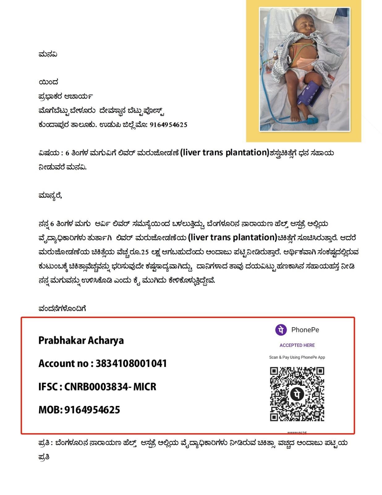ಕೊರ್ಗಿ ಪಂಚಾಯತ್ ವ್ಯಾಪ್ತಿಯ ಬಡ ಕುಟುಂಬದಲ್ಲಿ ಜನಿಸಿದ ಈ 6 ತಿಂಗಳ ಮಗುವು ಲಿವರ್ ಸಮಸ್ಯೆಯಿಂದ ಬಳಲುತಿದ್ದು, ಕಂದಮ್ಮನ ಚಿಕಿತ್ಸೆಗೆ ಸರಿ ಸುಮಾರು 25ಲಕ್ಷ ಅವಶ್ಯಕತೆ ಇರುತ್ತದೆ.…