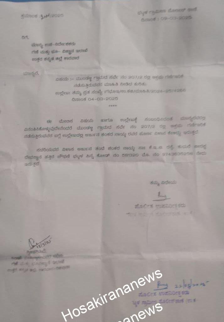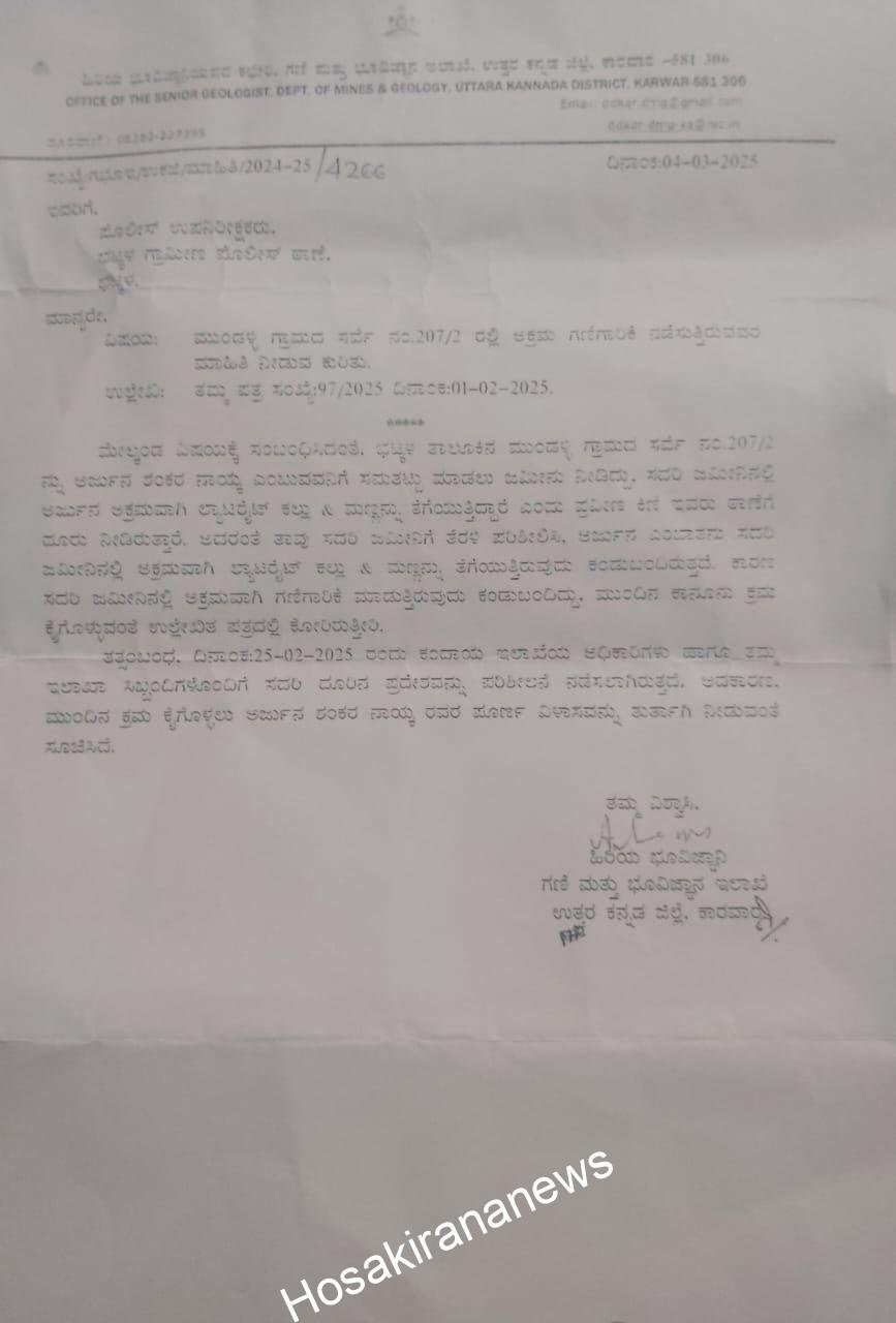 ಭಟ್ಕಳ ಗ್ರಾಮೀಣ ಪೊಲೀಸ್ ಠಾಣೆಗೆ ಪತ್ರ ಬರೆಯುತ್ತಾರೆ. ಫೆಬ್ರುವರಿ 25 ರಂದು ಸಂಜೆ 6 ಗಂಟೆಗೆ ಭಟ್ಕಳ ತಾಲೂಕಿನ ಮುಂಡಳ್ಳಿಯ ನೀರಗದ್ದೆ ವ್ಯಾಪ್ತಿಯ ಸರ್ವೇ ನಂಬರ 207/2 ಅಕ್ರಮ ಚಿರೇಕಲ್ಲು ಗಣಿಗಾರಿಕೆ ದಂದೆ ನಡೆಯುವ ಪ್ರದೇಶಕ್ಕೆ ಕಾರವಾರದ ಗಣಿ ಮತ್ತು ಭೂವಿಜ್ಞಾನ ಇಲಾಖೆಯ ಸ್ಥಳೀಯ ಅಧಿಕಾರಿಗಳು ಕಂದಾಯ ಅಧಿಕಾರಿಗಳು ಮತ್ತು ಪೊಲೀಸರೊಂದಿಗೆ ದಾಳಿ ನಡೆಸಿದ್ದಾಗ ಅದೇ ಅಕ್ರಮ ಚಿರೇಕಲ್ಲು ದಂದೆ ನಡೆಸುವ ಸ್ಥಳದಲ್ಲಿ ಚಿರೇಕಲ್ಲುನ್ನು ತೆಗೆಯುವ 2 ಯಂತ್ರಗಳು ಅಲ್ಲೇ ಇದ್ದರು ಸಹ ಅಧಿಕಾರಿಗಳು ಅದನ್ನು ಸೀಜ ಮಾಡಲಿಲ್ಲ ಮತ್ತು ವಶಪಡಿಸಿಕೊಳ್ಳ ಲಿಲ್ಲ. ಇದರಿಂದ ತಿಳಿಯುತ್ತೆ.