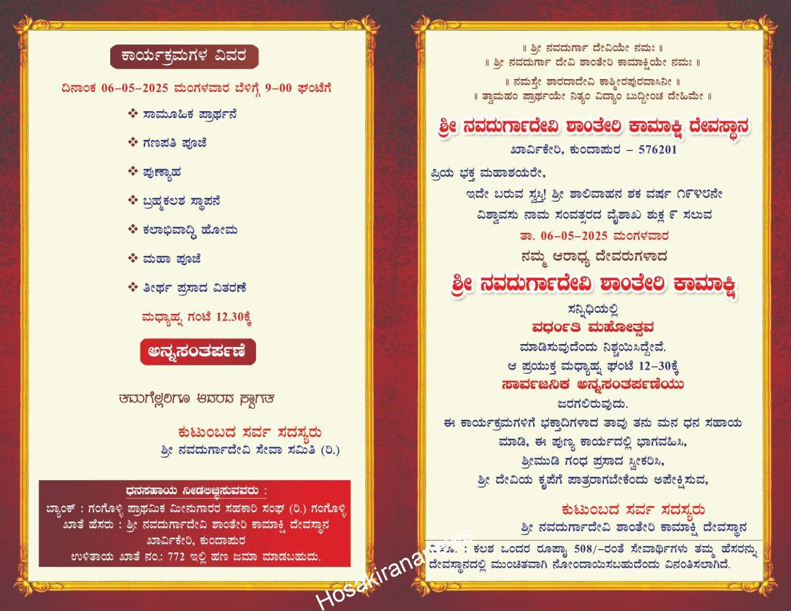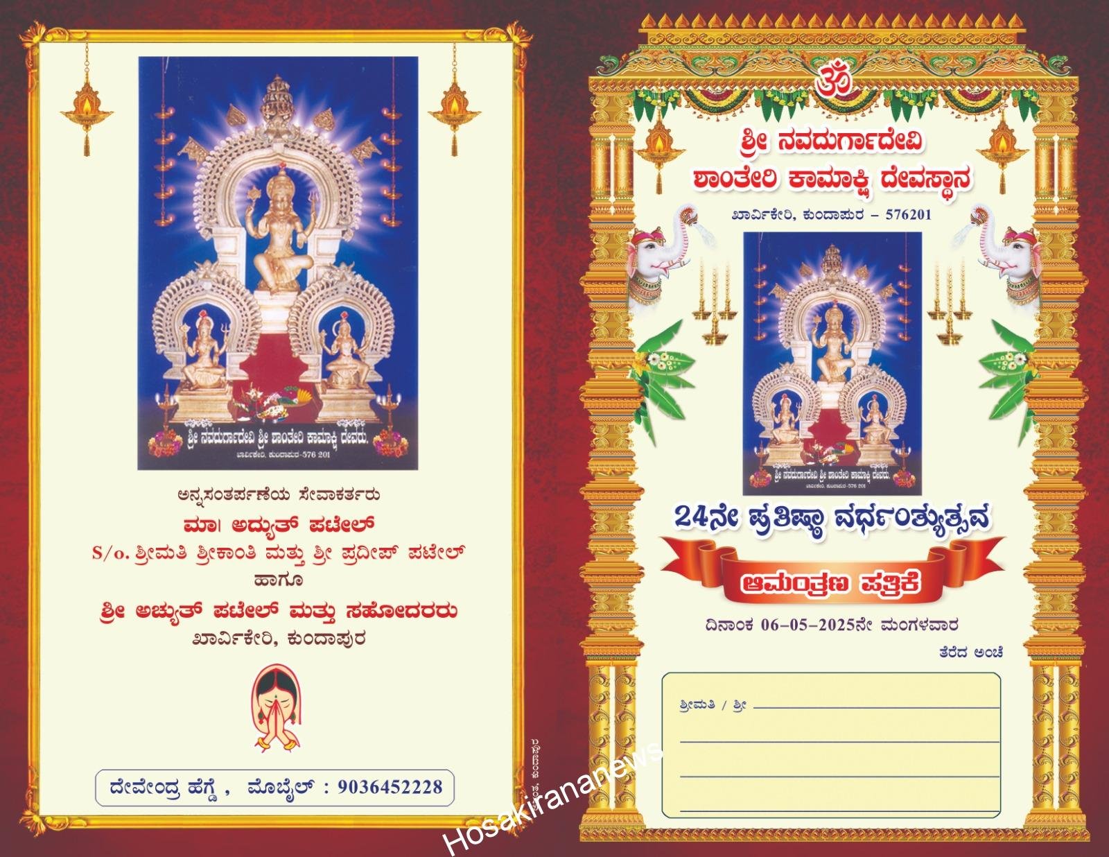 ಕುಂದಾಪುರ: ಇಲ್ಲಿನ ಹೊಸ ಬಸ್ ನಿಲ್ದಾಣದ ಖಾರ್ವಿಕೇರಿ ರಸ್ತೆಯಲ್ಲಿರುವ ಶ್ರೀ ನವದುರ್ಗಾದೇವಿ ಶಾಂತೇರಿ ಕಾಮಾಕ್ಷಿ ದೇವಸ್ಥಾನದಲ್ಲಿ ವರ್ಷಂಪ್ರತಿ ನಡೆಯುವ 24ನೇ ವರ್ಷದ ಪ್ರತಿಷ್ಠಾ ವರ್ಧಂತಿ ಮಹೋತ್ಸವು ಮೇ.6 ರಂದು ಜರುಗಲಿದೆ.
