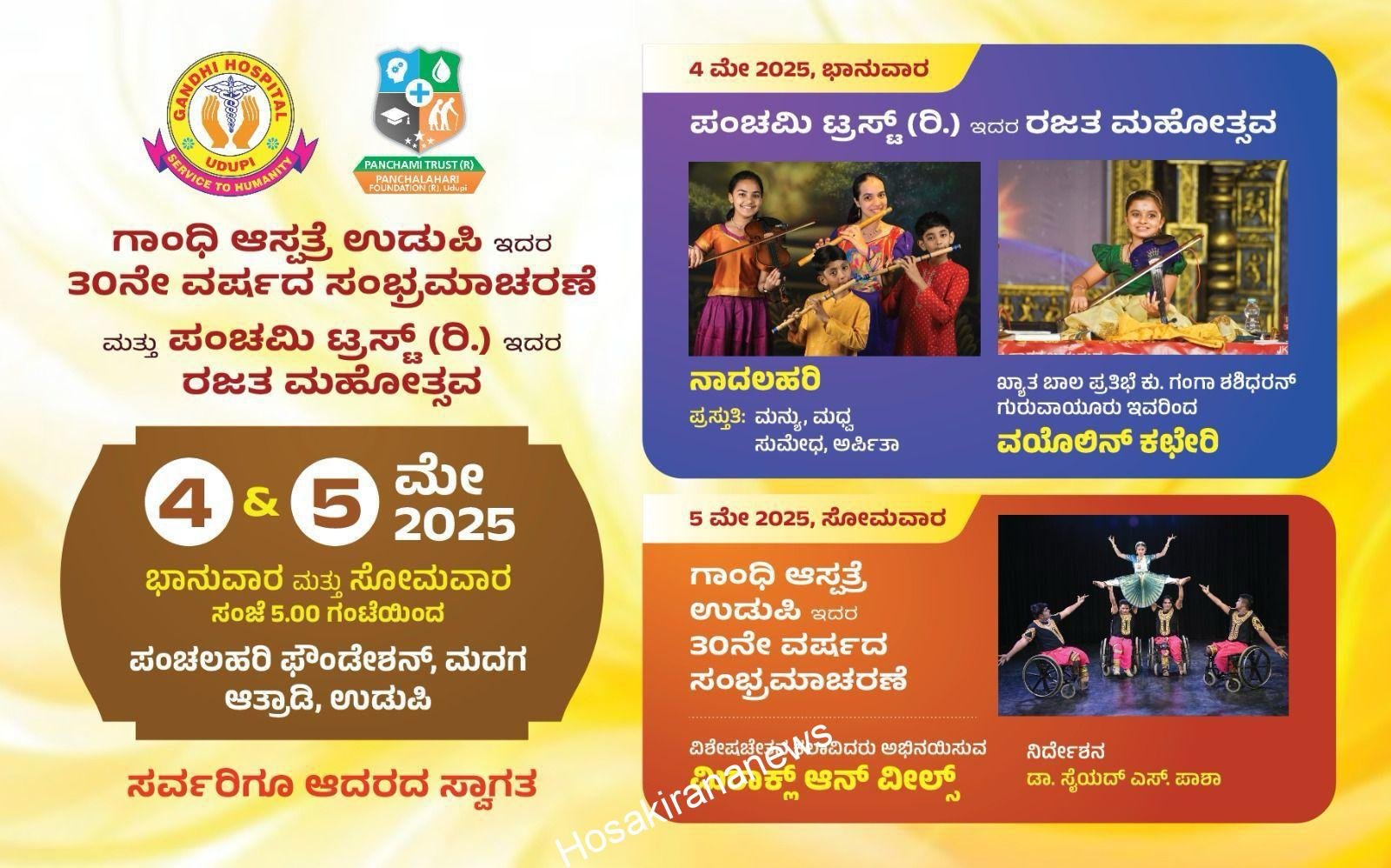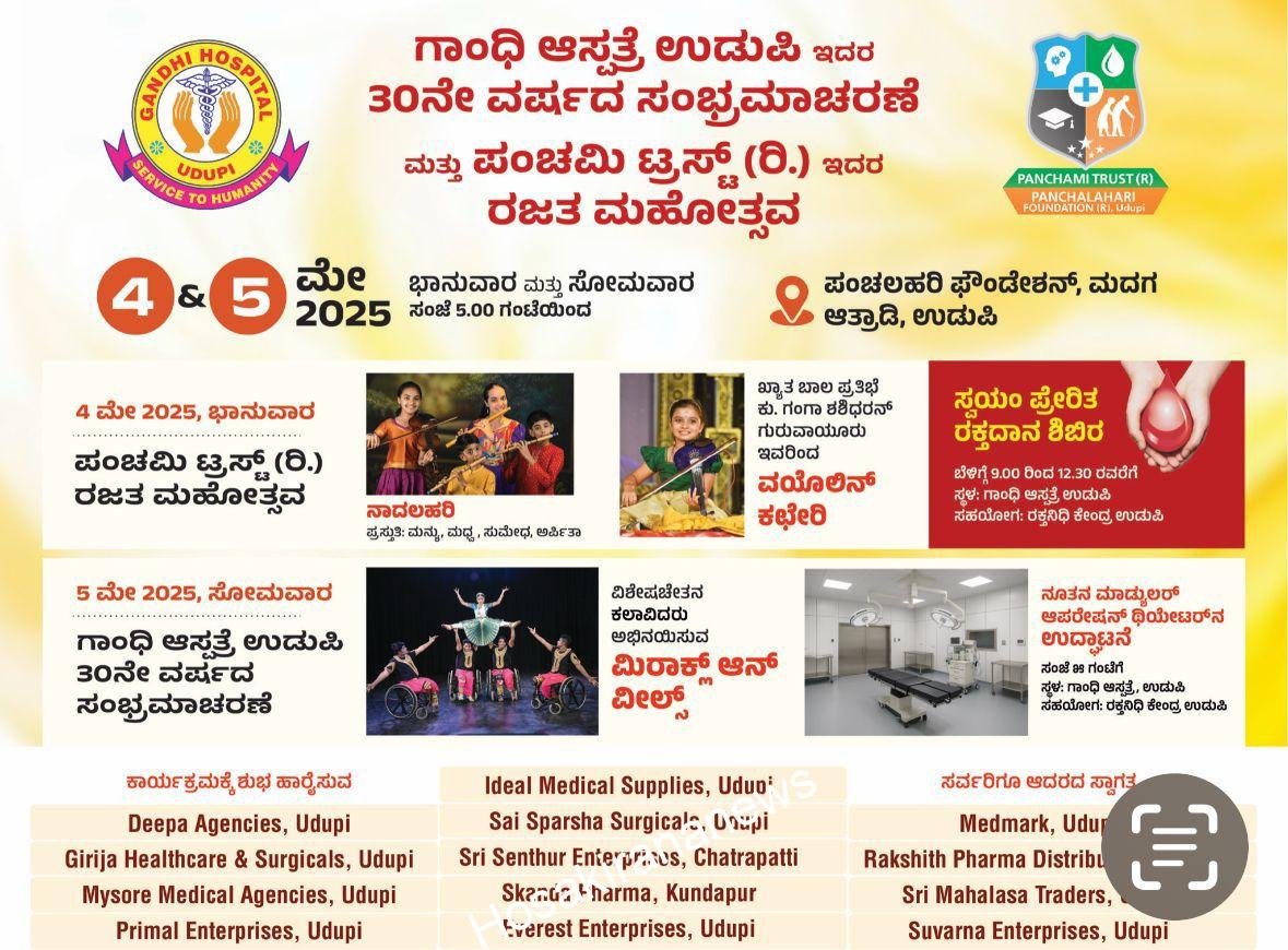 ಉಡುಪಿ ಗಾಂಧಿ ಆಸ್ಪತ್ರೆಗೆ ಮೂವತ್ತು ವರ್ಷ, ಪಂಚಮಿ ಟ್ರಸ್ಟ್ ಗೆ 25 ವರ್ಷದ ಸಂಭ್ರಮಾಚಾರಣೆಯು ಮೇ 4 ಹಾಗು. 5 ರಂದು ಆತ್ರಾಡಿ ಒಂತಿಬೇಟ್ಟುವಿನ ಮದಗದಲ್ಲಿ ನಡೆಯಲಿದೆ ಎಂದು ಆಸ್ಪತ್ರೆಯ ಆಡಳಿತ ನಿರ್ದೇಶಕ ಎಂ. ಹರೀಶ್ಚಂದ್ರ ತಿಳಿಸಿದರು.