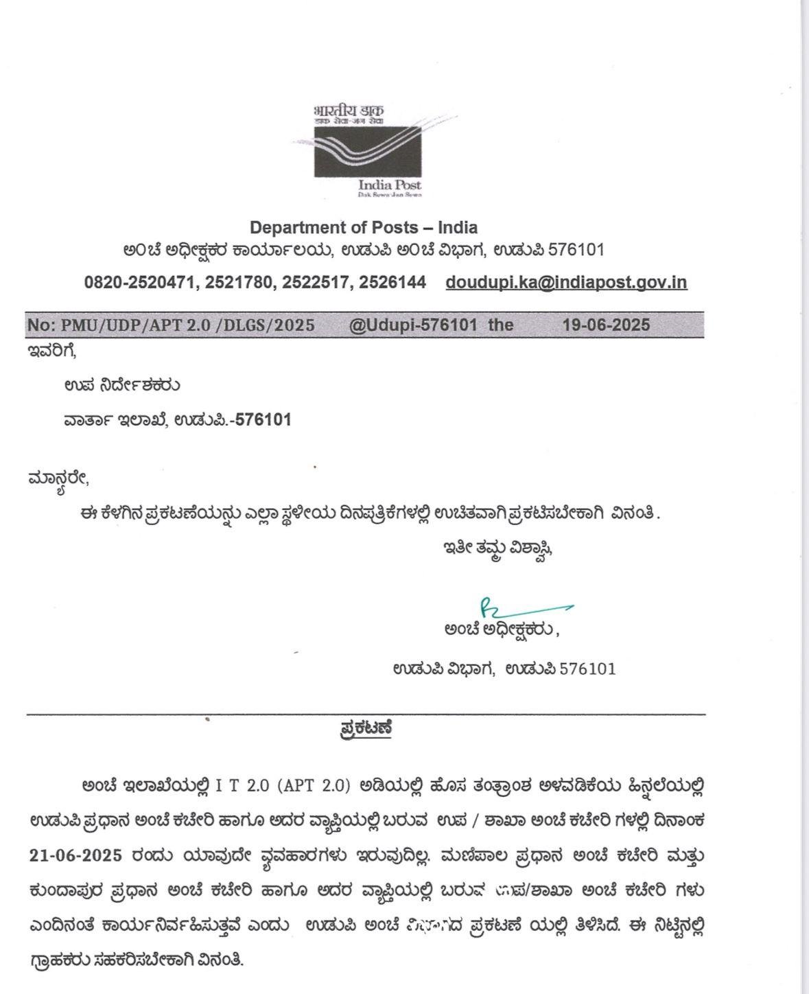 ಅಂಚೆ ಇಲಾಖೆಯಲ್ಲಿ I T 2.0 (APT 2.0) ಅಡಿಯಲ್ಲಿ ಹೊಸ ತಂತ್ರಾಂಶ ಅಳವಡಿಕೆಯ ಹಿನ್ನಲೆಯಲ್ಲಿ ಉಡುಪಿ ಪ್ರಧಾನ ಅಂಚೆ ಕಚೇರಿ ಹಾಗೂ ಅದರ ವ್ಯಾಪ್ತಿಯಲ್ಲಿ ಬರುವ…