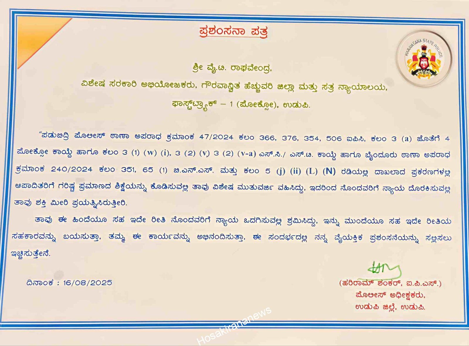 ಪಡುಬಿದ್ರೆ ಪೊಲೀಸ್ ಠಾಣಾ ಅಪರಾಧ ಕ್ರಮಾಂಕ 47/2024 ಮತ್ತು ಬೈಂದೂರು ಠಾಣಾ ಅಪರಾಧ ಕ್ರಮಾಂಕ 240/2024ರಲ್ಲಿ ದಾಖಲಾದ ಪ್ರಕರಣಗಳಲ್ಲಿ ಆಪಾದಿತರಿಗೆ ಗರಿಷ್ಠ ಪ್ರಮಾಣದ ಶಿಕ್ಷೆ ಕೊಡಿಸುವಲ್ಲಿ ವಿಶೇಷ ಮುತುವರ್ಜಿ ವಹಿಸಿದ್ದ  ವೈ.ಟಿ ರಾಘವೇಂದ್ರ ವಿಶೇಷ ಸರಕಾರಿ ಅಭಿಯೋಜಕರು, ಗೌರವಾನ್ವಿತ ಹೆಚ್ಚುವರಿ ಜಿಲ್ಲಾ ಮತ್ತು ಸತ್ರ ನ್ಯಾಯಾಲಯ, ಫಾಸ್ಟ್ ಟ್ರ್ಯಾಕ್ -(ಪೋಕ್ಸೋ), ಉಡುಪಿ ಇವರಿಗೆ ಜಿಲ್ಲಾ ಪೊಲೀಸ್‌ ಅಧೀಕ್ಷಕರು ಜಿಲ್ಲಾ ಕಚೇರಿಯಲ್ಲಿ ಪ್ರಶಂಸನ ಪತ್ರ ನೀಡಿ ಕಾರ್ಯವೈಖರಿಯನ್ನು ಶ್ಲಾಘಿಸಿರುತ್ತಾರೆ.