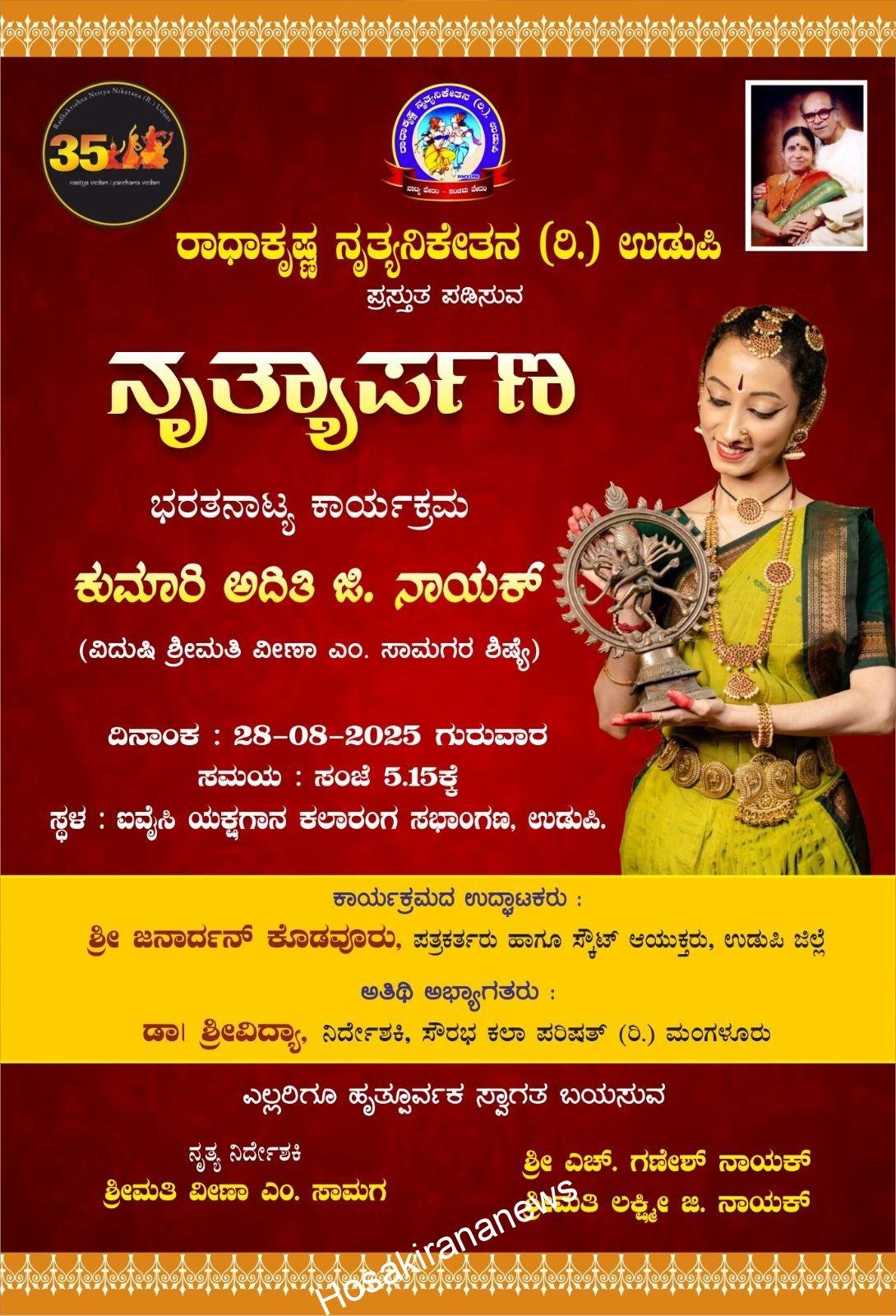 ರಾಧಾಕೃಷ್ಣ ನೃತ್ಯನಿಕೇತನ (ರಿ.) ಉಡುಪಿ ಪ್ರಸ್ತುತ ಪಡಿಸುವ ನೃತ್ಯಾರ್ಪಣ ಭರತನಾಟ್ಯ ಕಾರ್ಯಕ್ರಮದಲ್ಲಿ ಕುಮಾರಿ ಅದಿತಿ ಜಿ. ನಾಯಕ್ (ವಿದುಷಿ ಶ್ರೀಮತಿ ವೀಣಾ ಎಂ. ಸಾಮಗ ರ ಶಿಷ್ಯ)…
