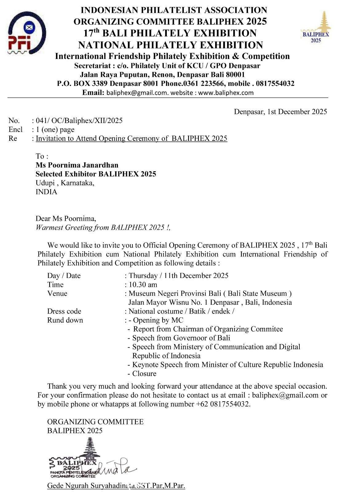 ಇಂಡೋನೇಷಿಯನ್ ಫಿಲಾಟಲಿಸ್ಟ್ ಅಸೋಸಿಯೇಷನ್ ತನ್ನ 17ನೇ ನ್ಯಾಷನಲ್ ಬಾಲಿ ಫಿಲಾಟಲಿ ಪ್ರದರ್ಶನ (Baliphex-2025)ದಲ್ಲಿ ಆಯೋಜಿಸಿರುವ ಇಂಟರ್ನ್ಯಾಷನಲ್ ಫ್ರೆಂಡ್ ಶಿಪ್ ಫಿಲಾಟಲಿ ಎಕ್ಸಿಬಿಷನ್ ಅಂಡ್ ಕಾಂಪಿಟೇಶನ್ ನಲ್ಲಿ ಉಡುಪಿ ಜಿಲ್ಲೆಯ ಫಿಲಾಟಲಿಸ್ಟ್, ಅಂಚೆ ಇಲಾಖಾ ಉಡುಪಿ ವಿಭಾಗದ ಉದ್ಯೋಗಿ ಪೂರ್ಣಿಮಾ ಜನಾರ್ದನ್ ರವರು ತಮ್ಮಸಂಗ್ರಹಣೆಯ “Discovering The Divine: An Exploration of Hindu Deities” ಫಿಲಾಟಲಿ ಪ್ರದರ್ಶನದೊಂದಿಗೆ ಭಾಗವಹಿಸಲಿದ್ದಾರೆ.
