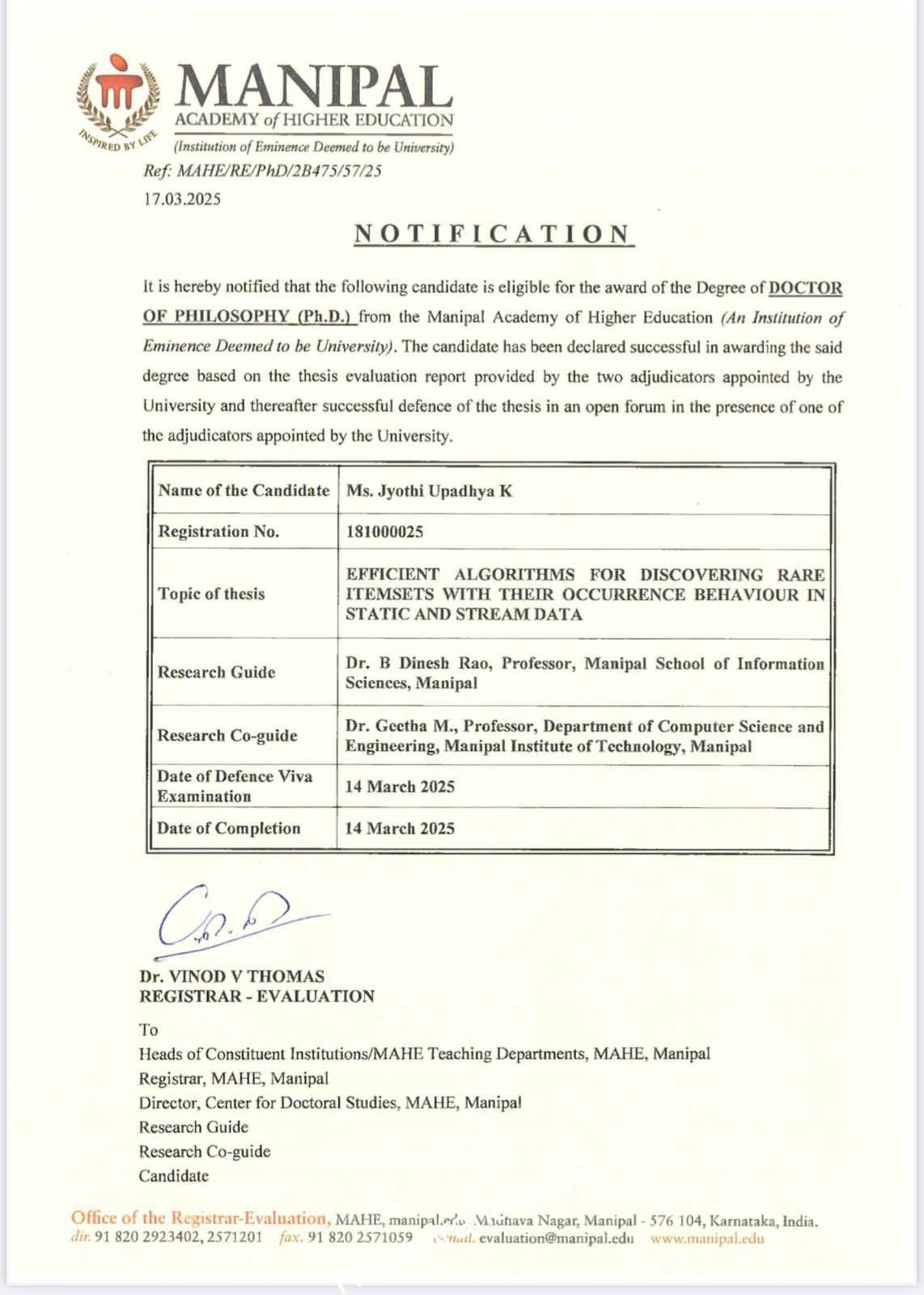 ಮಣಿಪಾಲದ ಎಮ್ ಐ ಟಿ ಯ ಕಂಪ್ಯೂಟರ್ ಸಯನ್ಸ್ ಅಂಡ್ ಇಂಜಿನಿಯರಿಂಗ್ ವಿಭಾಗದ ಜ್ಯೋತಿ ಉಪಾಧ್ಯ ಕೆ. ಇವರು ಡಾ| ಬಿ. ದಿನೇಶ್ ರಾವ್ ಮತ್ತು ಡಾ| ಗೀತಾ ಮಯ್ಯರ ಮಾರ್ಗದರ್ಶನದಲ್ಲಿ ಮಂಡಿಸಿದ “ಎಫಿಷಿಯೆಂಟ್ ಅಲ್ಗೊರಿಥಮ್ಸ್ ಫಾರ್ ಡಿಸ್ಕೋವೆರಿಂಗ್ ರೇರ್ ಐಟಂಸೆಟ್ಸ್ ವಿಥ್ ದ್ಯೆಯರ್ ಅಕ್ಕರೆನ್ಸ್ ಬಿಹೇವಿಯರ್ ಇನ್ ಸ್ಟಾಟಿಕ್ ಅಂಡ್ ಸ್ಟ್ರೀಮ್ ಡೇಟಾ” ಮಹಾಪ್ರಭಂದಕ್ಕೆ ಮಣಿಪಾಲ ಅಕಾಡೆಮಿ ಆಫ್ ಹೈಯರ್ ಎಜುಕೇಶನ್ (ಮಾಹೆ) ಡಾಕ್ಟರ್ ಆಫ್ ಫಿಲಾಸಫಿ ಪದವಿ ನೀಡಿದೆ.