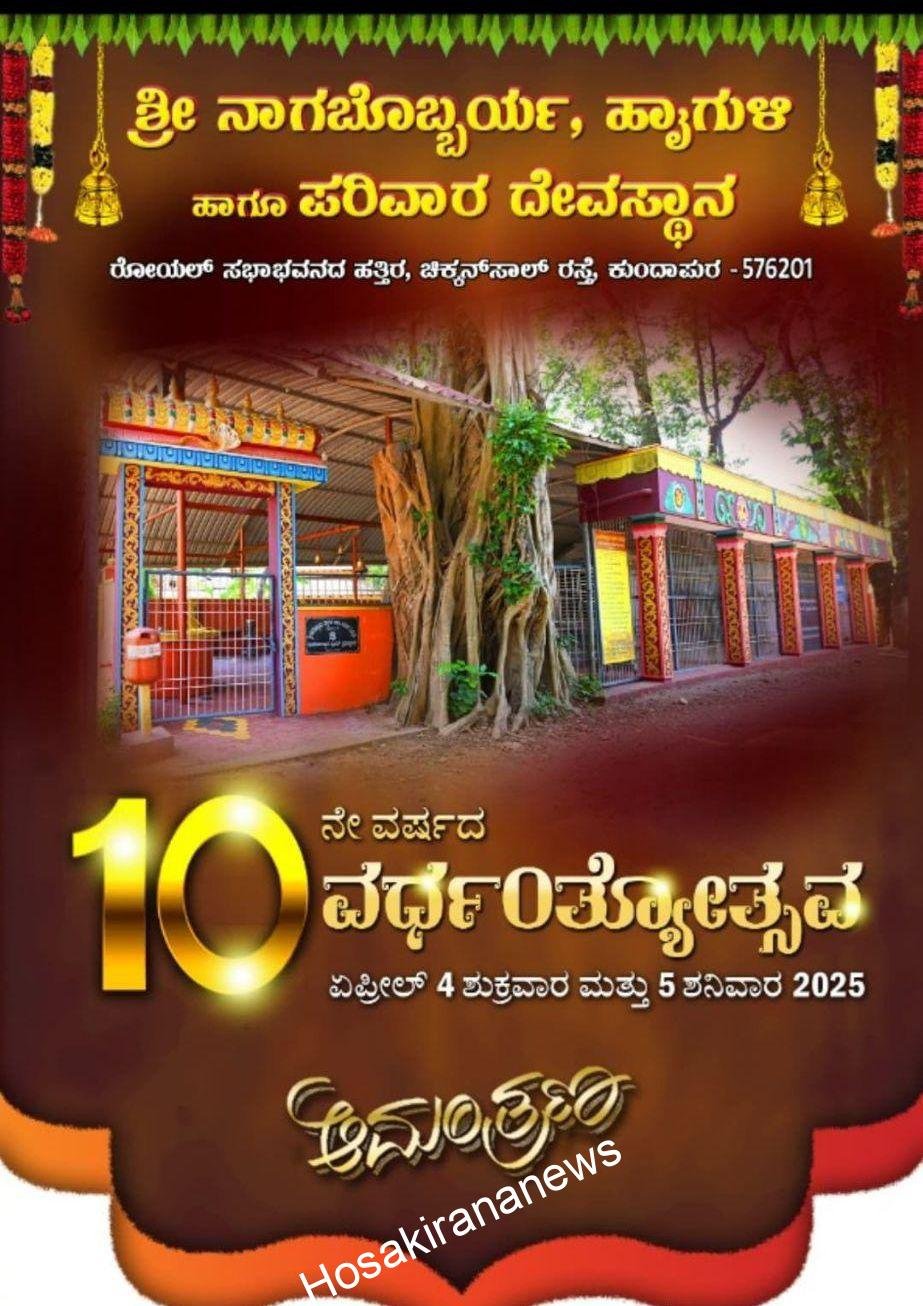 ರೋಯಲ್ ಸಭಾಭವನದ ಹತ್ತಿರದ ಶ್ರೀನಾಗಬೊಬ್ಬರ್ಯ, ಹಾಯ್ಗುಳಿ ಹಾಗೂ ಪರಿವಾರ ದೇವಸ್ಥಾನದ 10ನೇ ವರ್ಷದ ವರ್ಧಂತ್ಯೋತ್ಸವವು ಎ.5 ರಂದು ವಿವಿಧ ಧಾರ್ಮಿಕ ಕಾರ್ಯಕ್ರಮ ಗಳೊಂದಿಗೆ ಜರಗಲಿರುವುದು.