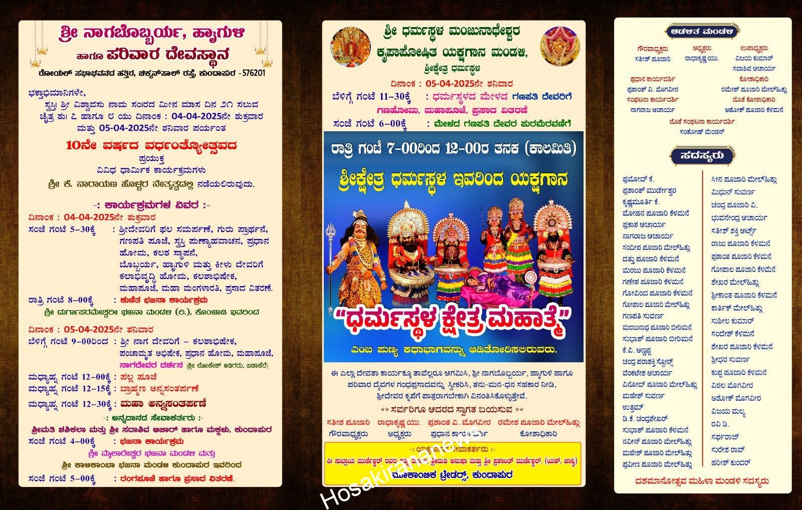 ಶ್ರೀ ಧರ್ಮಸ್ಥಳ ಮಂಜುನಾಥೇಶ್ವರ ಕೃಪಾಪೋಷಿತ ಯಕ್ಷಗಾನ ಮಂಡಳಿ ಇವರಿಂದ “ಶ್ರೀ ಧರ್ಮಸ್ಥಳ ಕ್ಷೇತ್ರ ಮಹಾತ್ಮೆ” ಎಂಬ ಯಕ್ಷಗಾನ ಪ್ರಸಂಗ ನಡೆಯಲಿದೆ ಎಂದು ದೇವಳದ ಅಧ್ಯಕ್ಷರಾದ ಯು.ರಾಧಾಕೃಷ್ಣ ಅವರು ಪ್ರಕಟಣೆಯಲ್ಲಿ ತಿಳಿಸಿದ್ದಾರೆ.